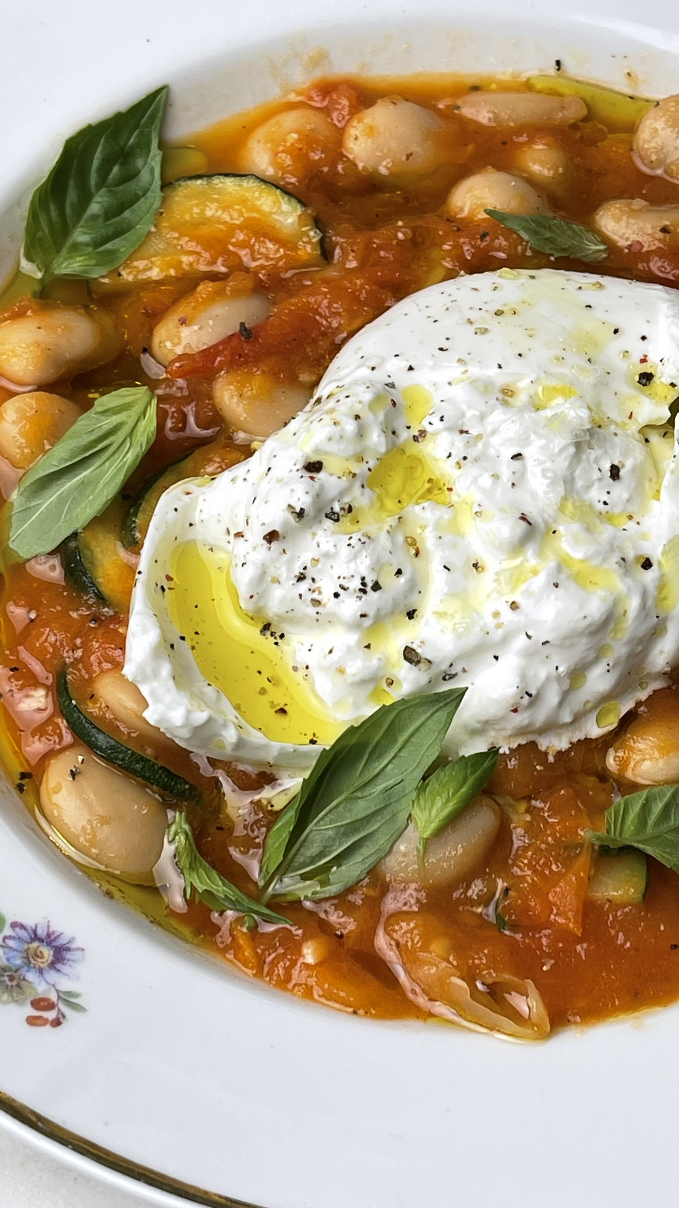 Pomidorų ir pupelių troškinys su burrata