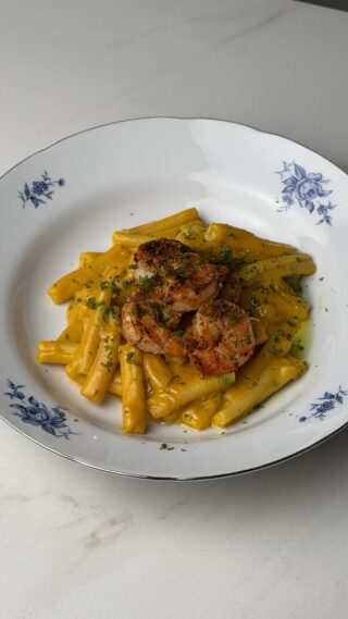 Makaronai su krevetėmis moliūgų padaže