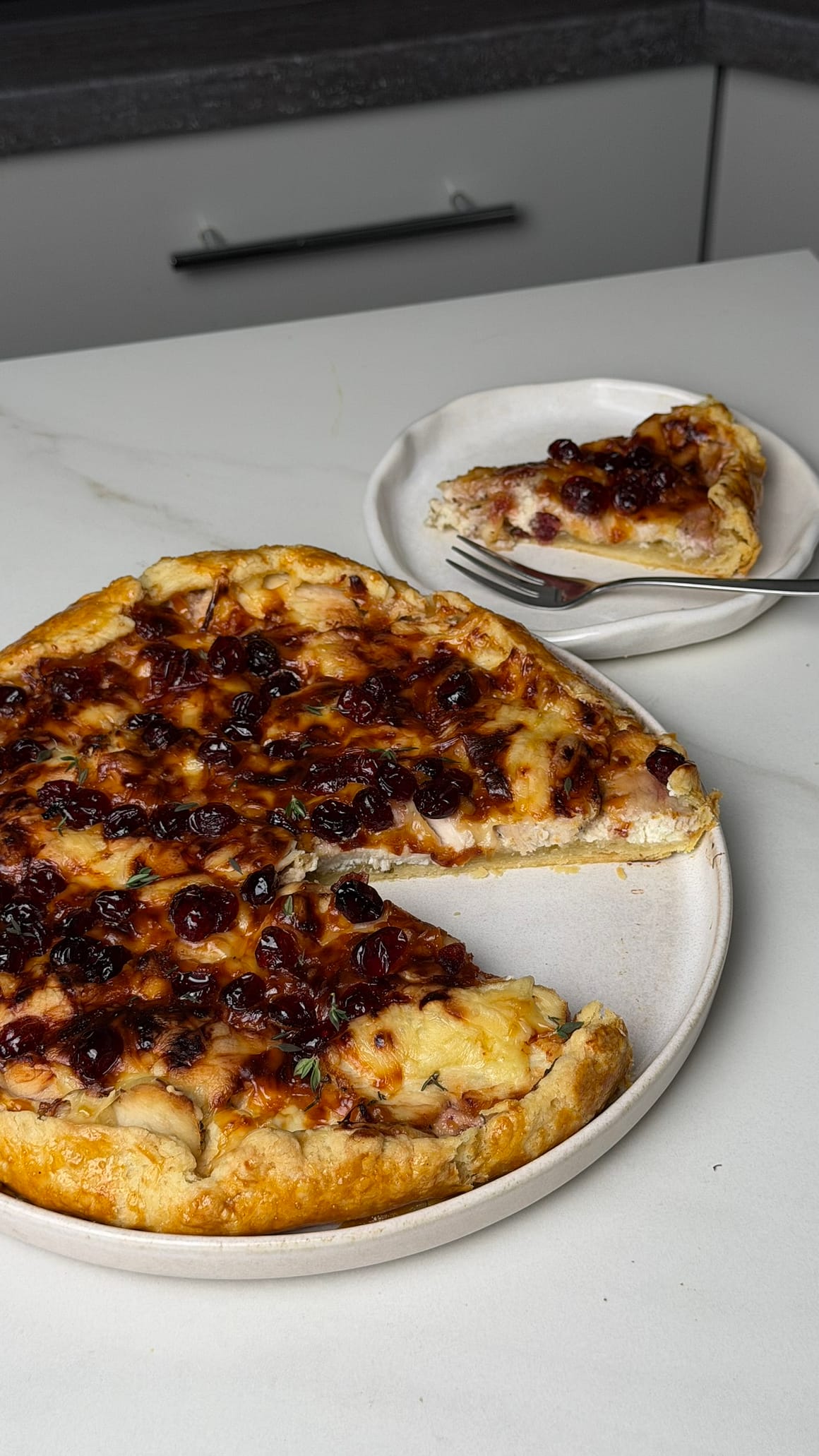 4. Kočiojame tešlą, tepame kreminį sūrį, dėliojame vištieną, sūrį, tolygiai paskirstome spanguoles, užlankstome kraštus ir aptepame kiaušinio plakiniu