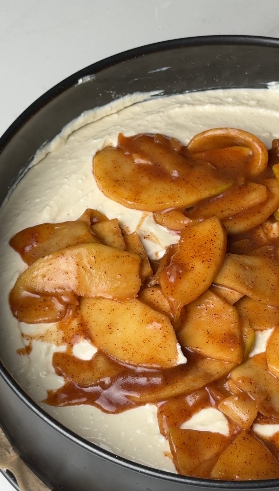 4. Ant formos pagrindo klojame sviestinį popierių, beriame trupinius ir stiklinės ar rankos pagalba juos suspaudžiame, tuomet dedame varškės masę, ant paviršiaus paskirstome obuolius ir apibarstome trupiniais su pekano riešutais.