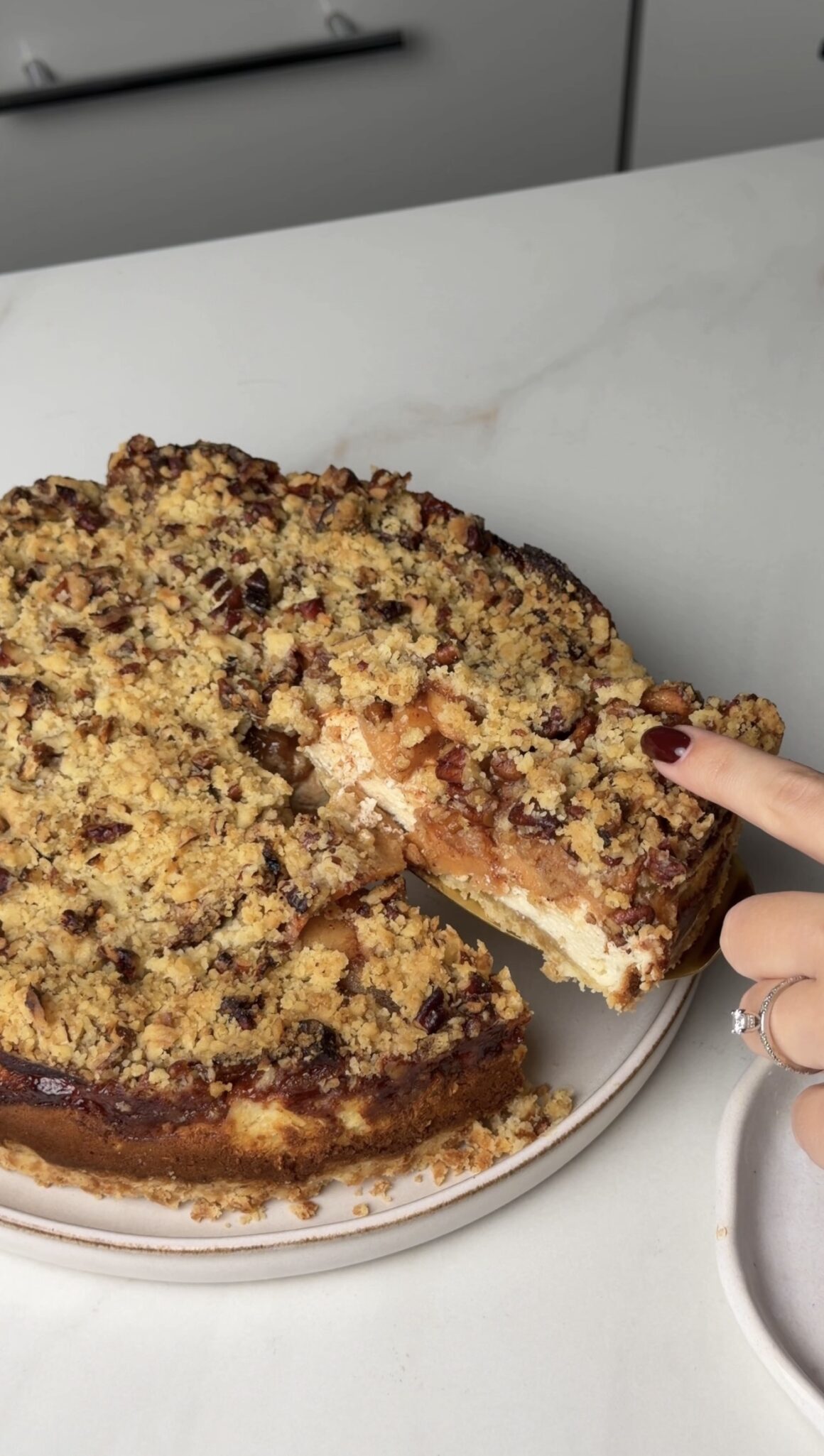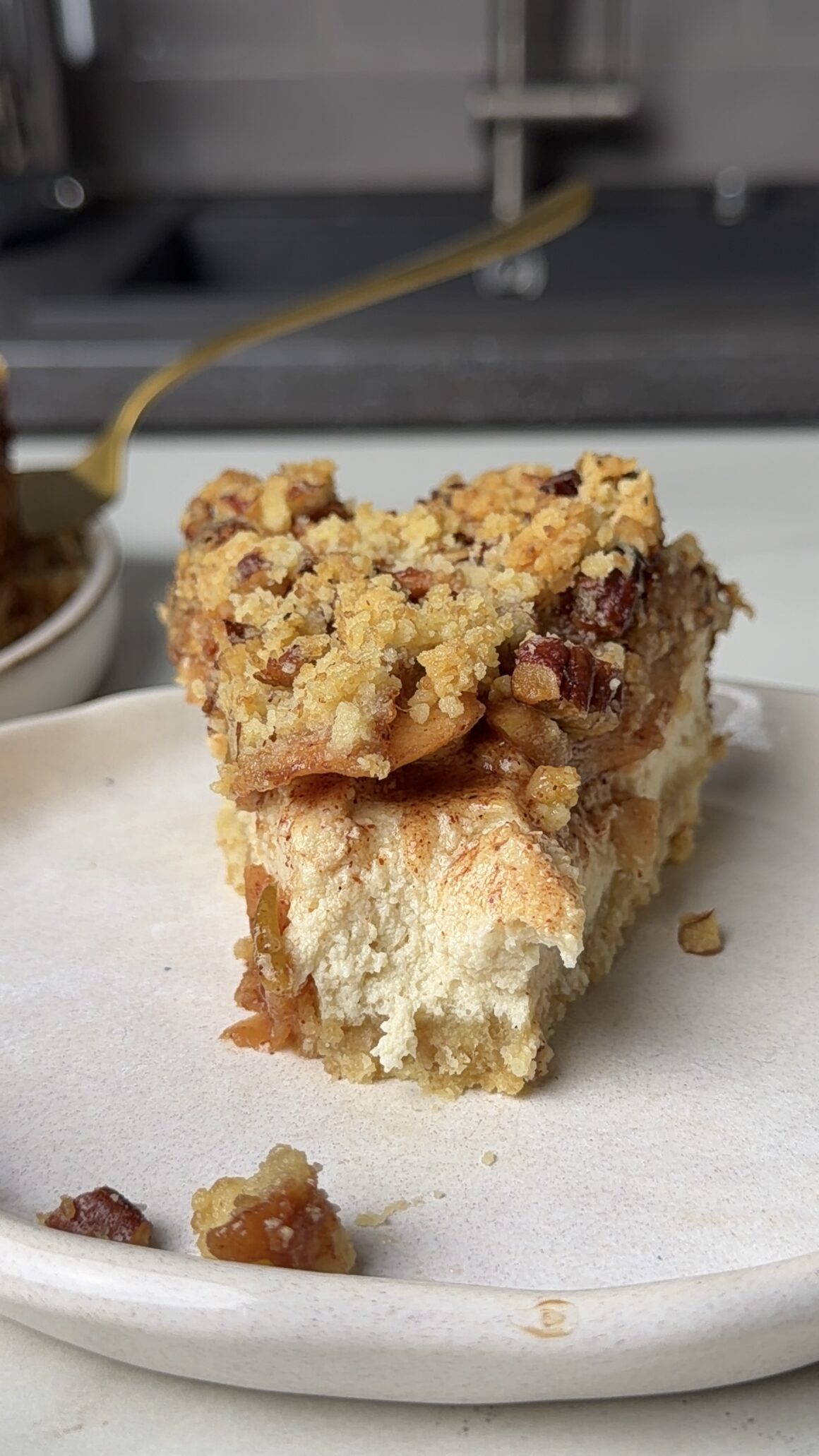 4. Ant formos pagrindo klojame sviestinį popierių, beriame trupinius ir stiklinės ar rankos pagalba juos suspaudžiame, tuomet dedame varškės masę, ant paviršiaus paskirstome obuolius ir apibarstome trupiniais su pekano riešutais.