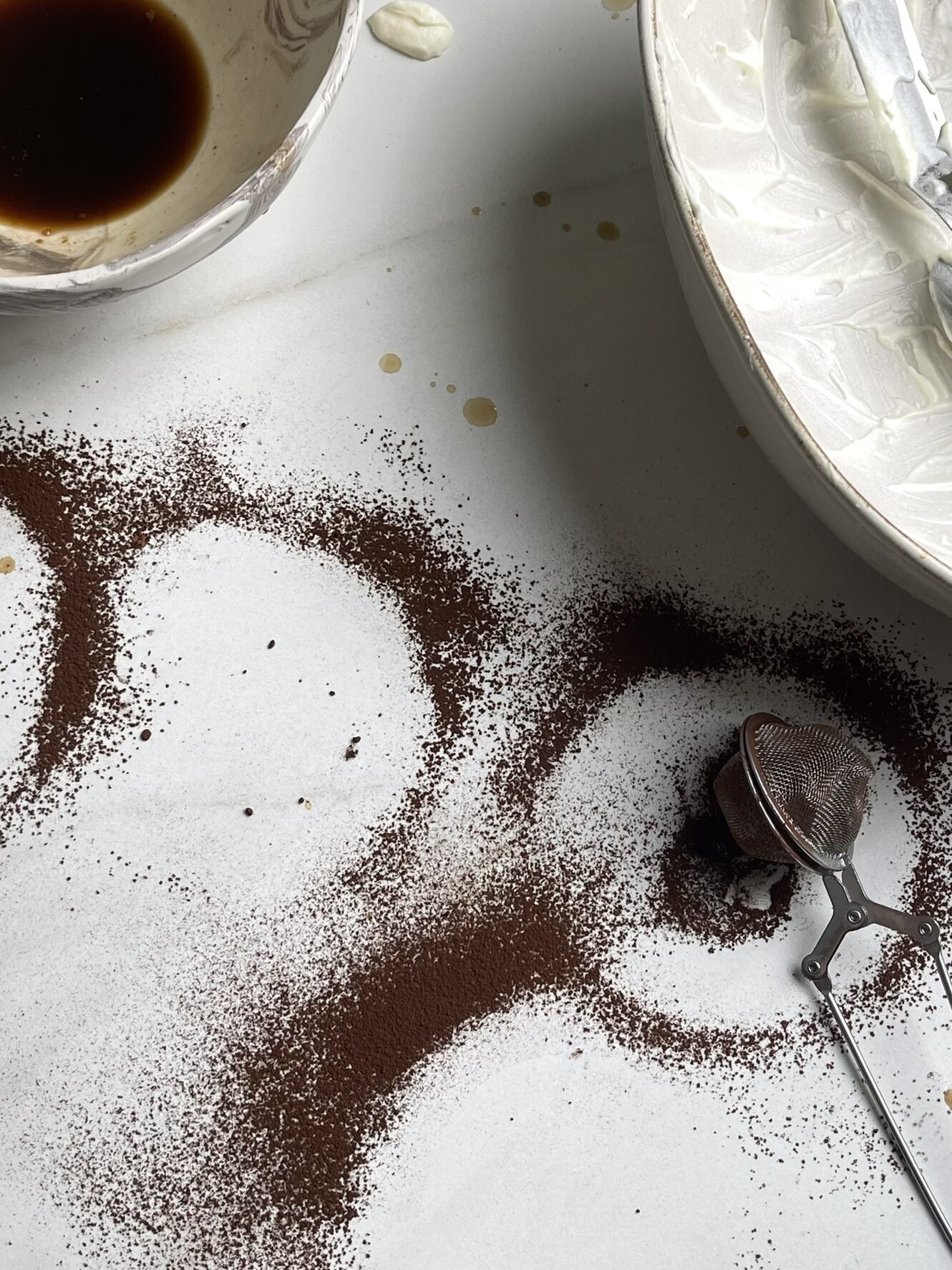 1. Pirmiausia pasiruoškime kavą, kad ji spėtų visiškai atvėsti iki pradėsime sluoksniuoti, aš kavą ruošiu kavinuko pagalba, tačiau jeigu jo neturite pasiruoškite stiprios užplikomos kavos. Paruoštą kavą sumaišome kavą su nealkoholniniu romu/likeriu.