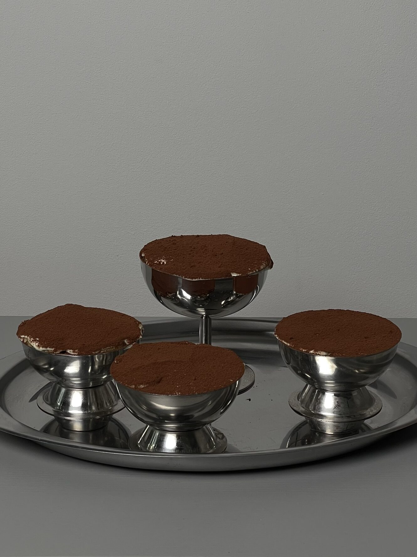 5. Pradedame sluoksniuoti inde ar atskiruose indeliuose, kavoje pamirkome sausainius, tuomet dedame kremą, barstome kakava, vėl dedame sausainius ir pakartojame kremą, galiausiai barstome kakava (aš tai darau iš karto prieš padedant į šaldytuvą, tam kam išvengti springimo kakava avarijų, nu kam nėra buvę).
