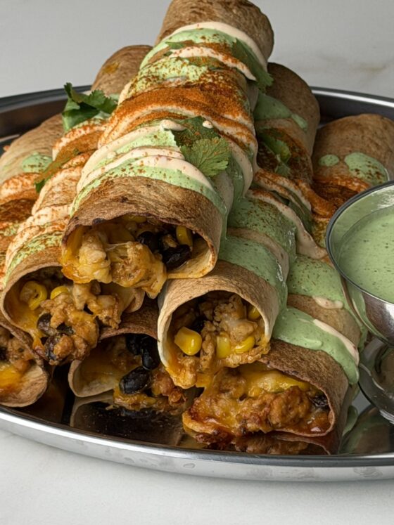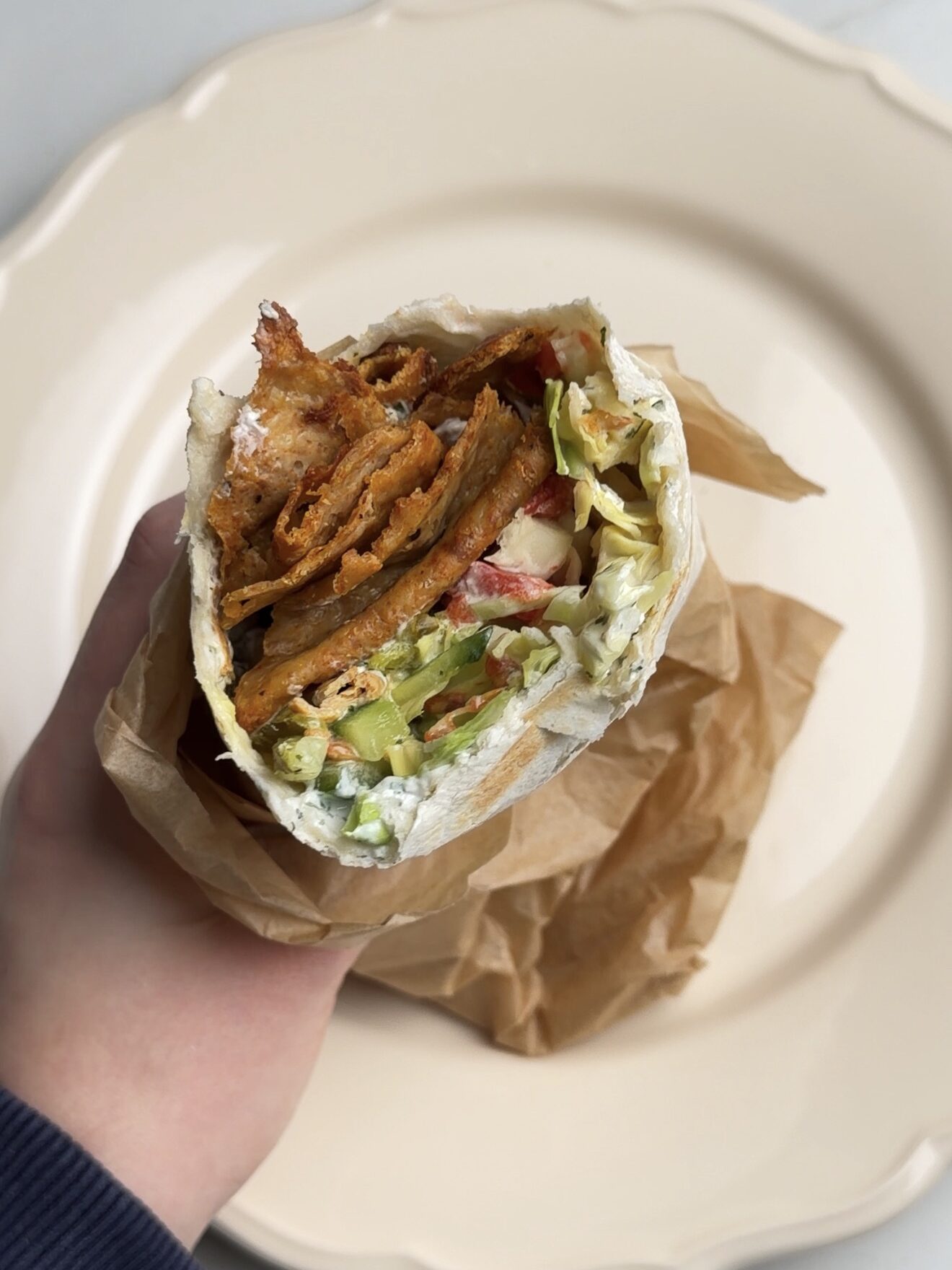 5. Ant tortilijos tepame padažą, dedame daržoves mėsytę dar šiek tiek padažo, suvyniojame ir galime apkepti grilinėje.