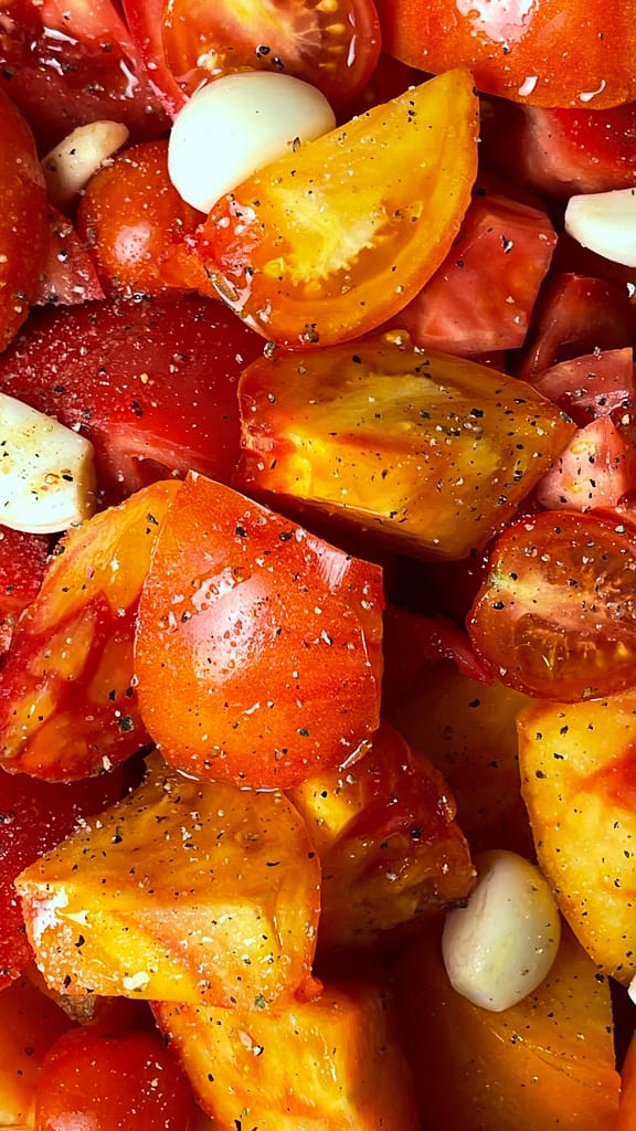 1. Pomidorus stambiai supjaustome, dedame česnaką, gardiname druska, pipirais, apšlakstome alyvuogių aliejumi ir kepame iki 190C įkaitintoje orkaitėjė 30-40 min
