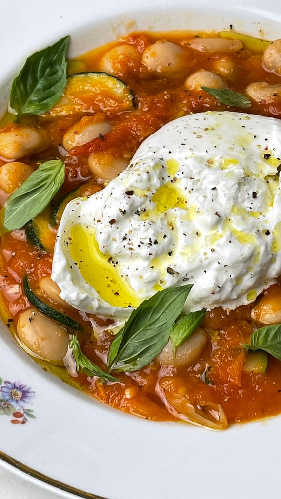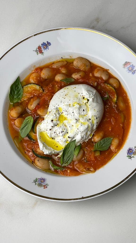 3. Serviruojame kartu su burrata sūriu, šviežiu baziliku, alyvuogių aliejumi, maldon druska, pipirais ir mėgstama skrudinta duonele.