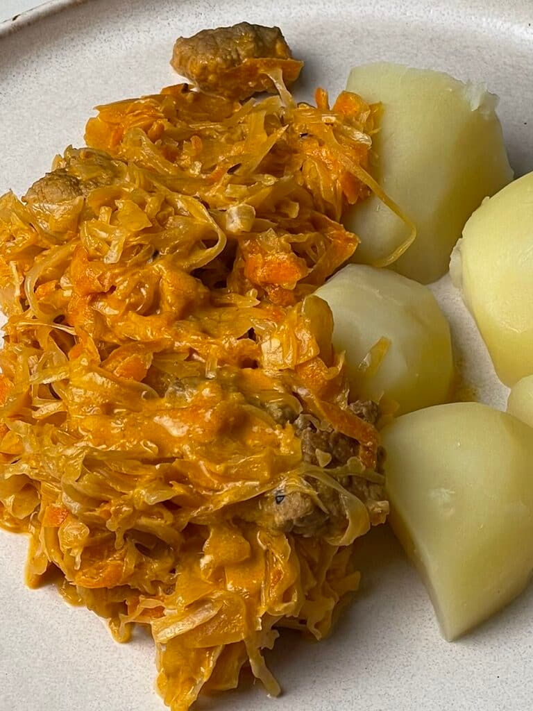 4. Į puodą su kopūstais sukrečiame mėsą su morkomis, uždengiame dangčiu ir troškiname apie 40 min, tuomet supilame grietinėlę ir troškiname dar 20 minučių.