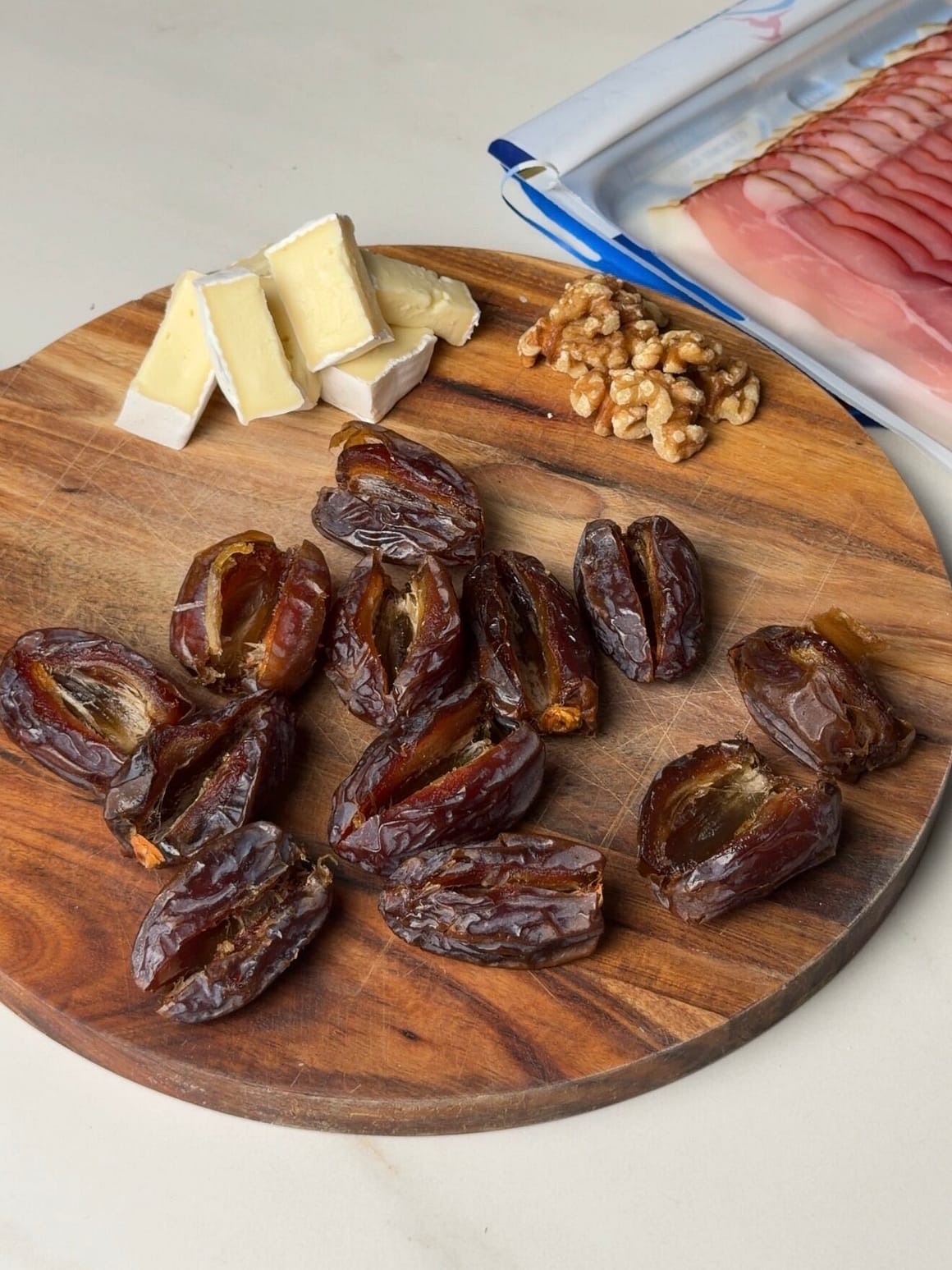 Datules gaminau su dviem skirtingais įdarais vienoms naudojau brie sūrį bei graikinius riešutus o kitoms mėlynojo pelėsio sūrį, visas datules vyniotojau į juodąjį Biovela kumpį, kuris puikiai dera su šventinėmis akimirkomis.