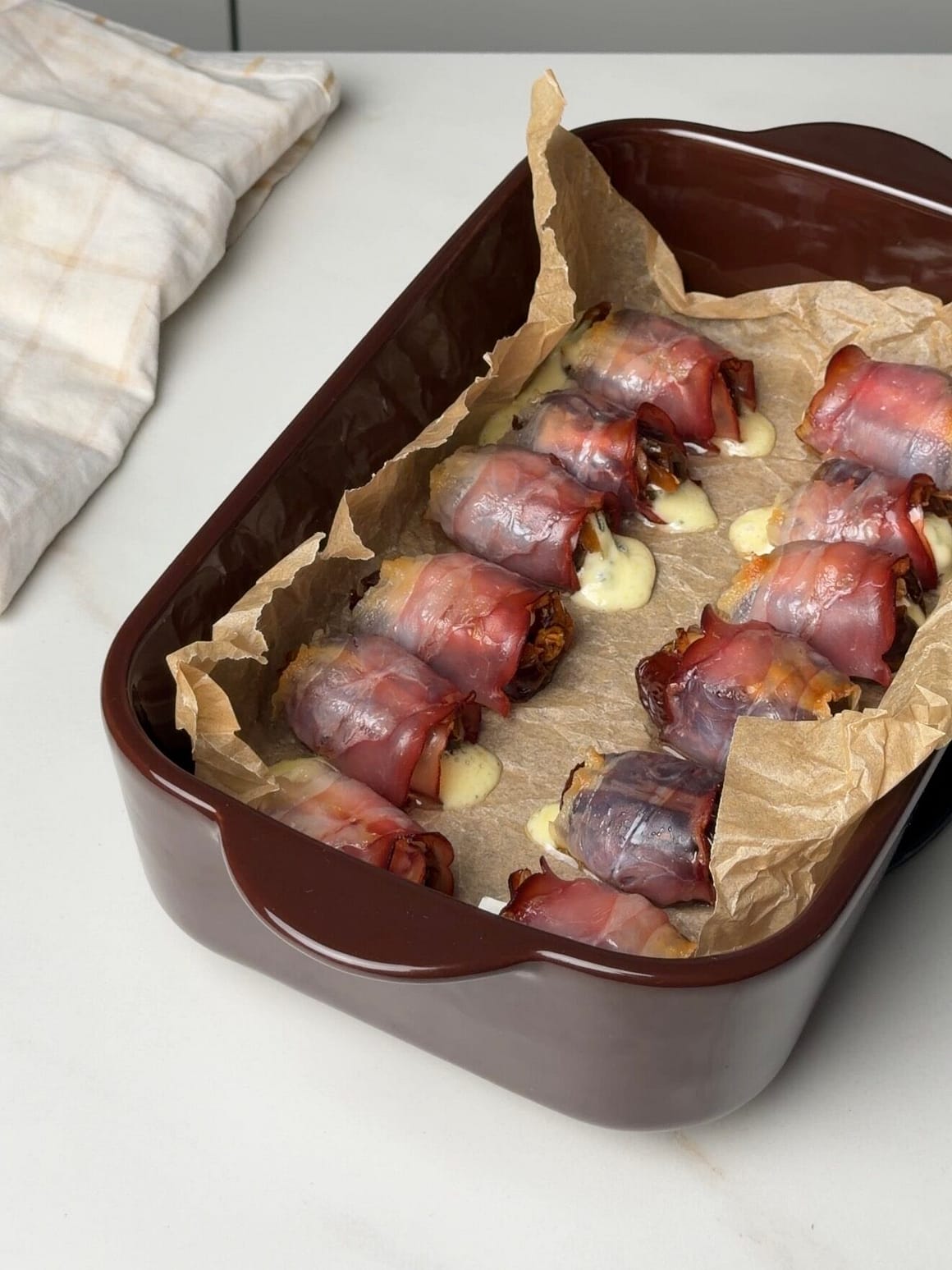 Datules gaminau su dviem skirtingais įdarais vienoms naudojau brie sūrį bei graikinius riešutus o kitoms mėlynojo pelėsio sūrį, visas datules vyniotojau į juodąjį Biovela kumpį, kuris puikiai dera su šventinėmis akimirkomis.