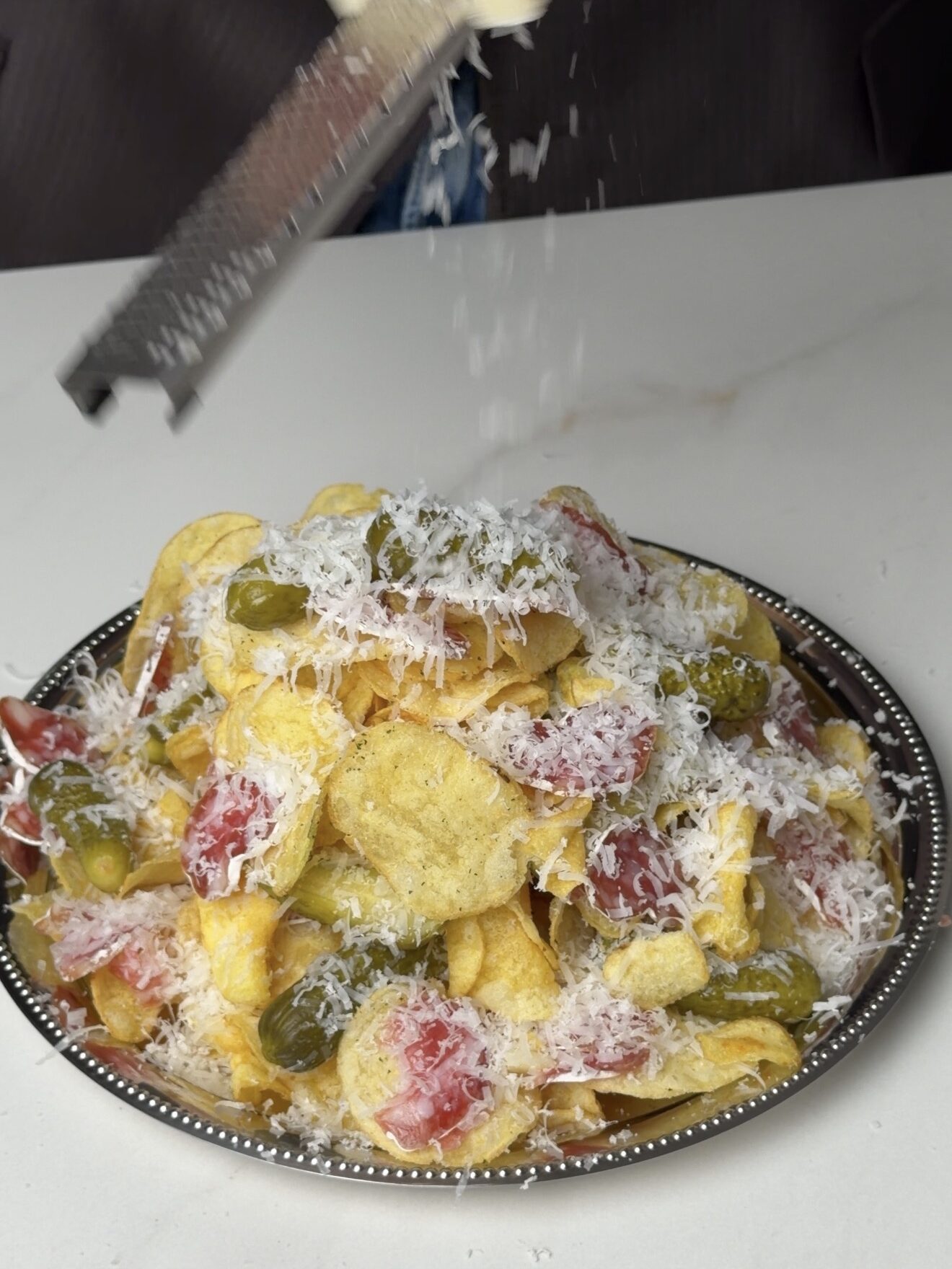 Sluoksniais dėliojame traškučius, plonai pjaustytą dešrą, agurkėlius ir gausiai tarkuojame sūriu.