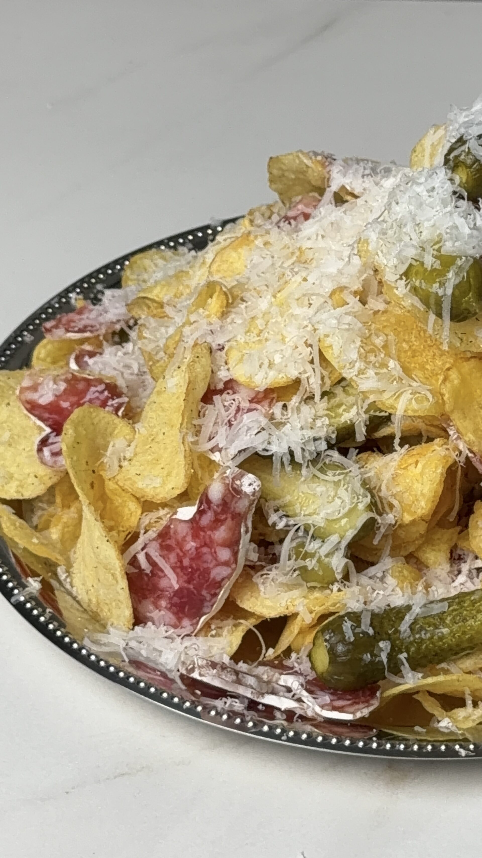 Sluoksniais dėliojame traškučius, plonai pjaustytą dešrą, agurkėlius ir gausiai tarkuojame sūriu.